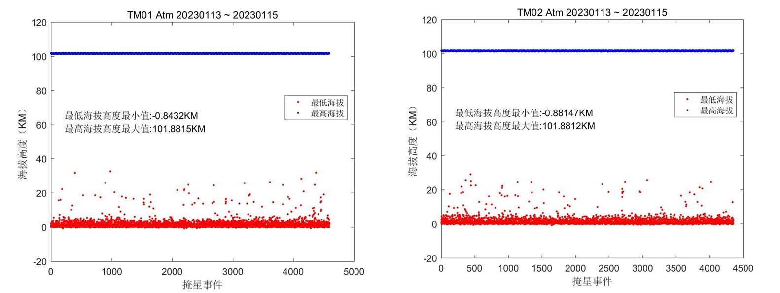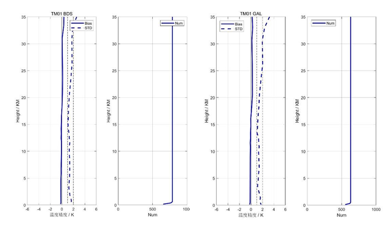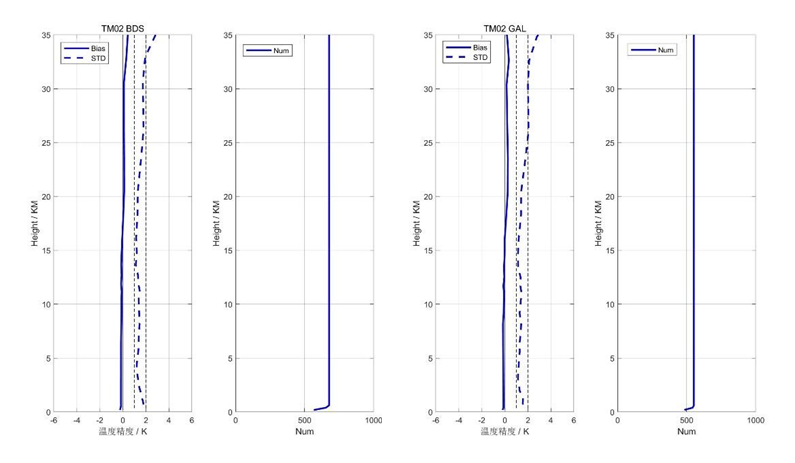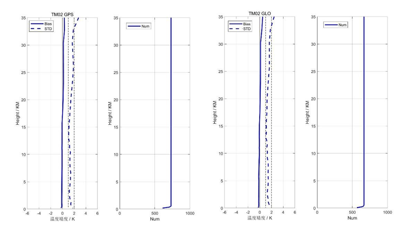 | 质量评估结果 | 大气掩星探测高度范围 指标要求:高度范围为 0.2~60 千米。 测试方法:统计 3 天业务系统生成的大气层掩星 L2 掩星事件的海拔高度范围。 测试情况: 1)数据源:2023 年 01 月 13 日至 2023 年 01 月 15 日。 2)测试结果: ![]() Preview 3)测试结果满足情况: TM01/02 星的大气掩星探测高度范围满足测试要求。 大气掩星折射率精度评估 指标要求:平均偏差小于1%(5km~35km),即为符合。 测试方法:使用业务上近实时生成的L2干大气廓线产品,与分析或再分析场模式数据进行对比统计分析,统计三天,评估大气掩星折射率精度。 测试情况: 1)数据源:2023 年 04 月 02 日至 2023 年 04 月 04 日。 2)测试结果: ![]() Preview ![]() Preview ![]() Preview ![]() Preview 3)测试结果满足情况: TM01/02星的大气掩星折射率精度满足测试要求。 | 大气掩星温度精度评估 指标要求:平均偏差小于 1K(5km~35km),即为符合。 测试方法:使用业务上近实时生成的L2湿大气廓线产品,与分析或再分析场模式数据进行对比统计分析,统计三天,评估大气掩星温度精度。 测试情况: 1)数据源:2023 年 04 月 02 日至 2023 年 04 月 04 日。 2)测试结果: TM01: ![]() Preview ![]() Preview TM02: ![]() Preview ![]() Preview 3)测试结果满足情况:TM01/02 星的大气掩星温度精度满足测试要求。 |